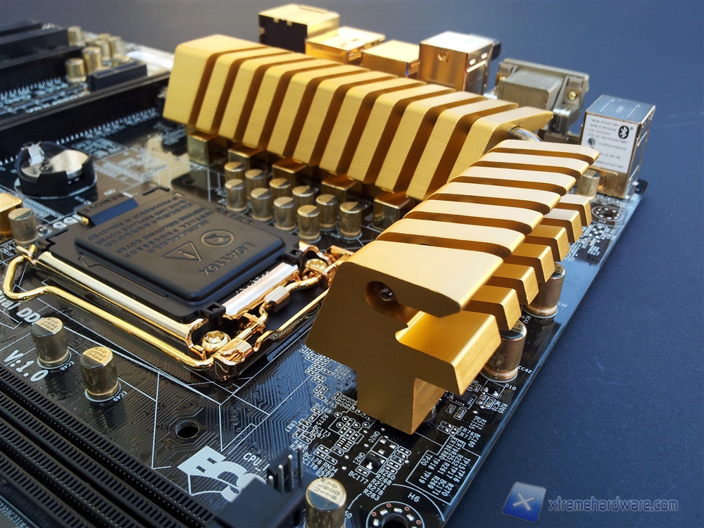 Le induttanze e i condensatori sono tutti di colorazione dorata così come il socket LGA 1155 che è dorato sia frontalmente che nel backplate. La scheda madre in questione è disposta di alimentazione a 9 fasi in ferrite, inoltre sia i pin della CPU che quelli delle RAM sono caratterizzati da un utilizzo leggermente superiore di oro che dovrebbe garantirne una maggior affidabilità nel tempo.