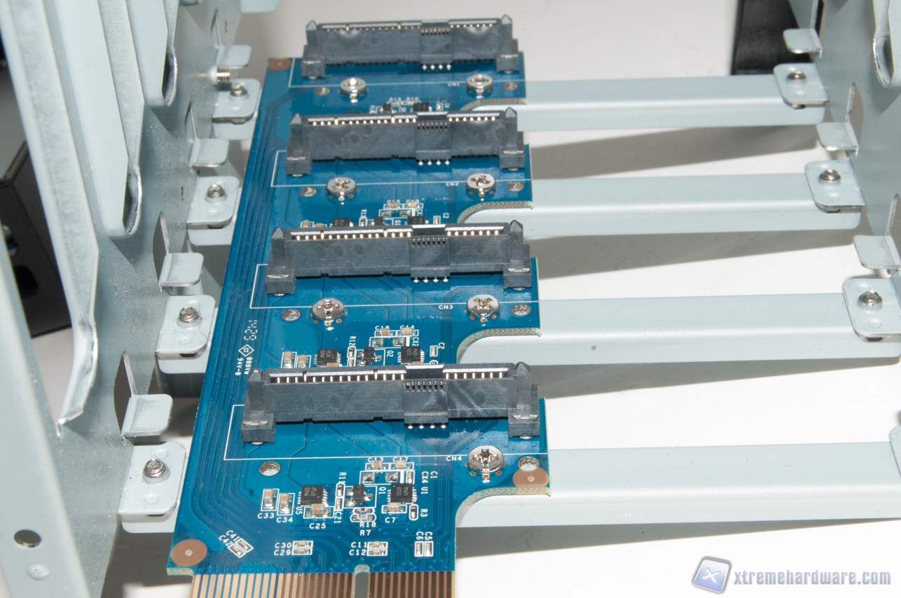 Avvitata al vano dischi in metallo troviamo la scheda ospitante i quattro connettori SATA dati e alimentazione.